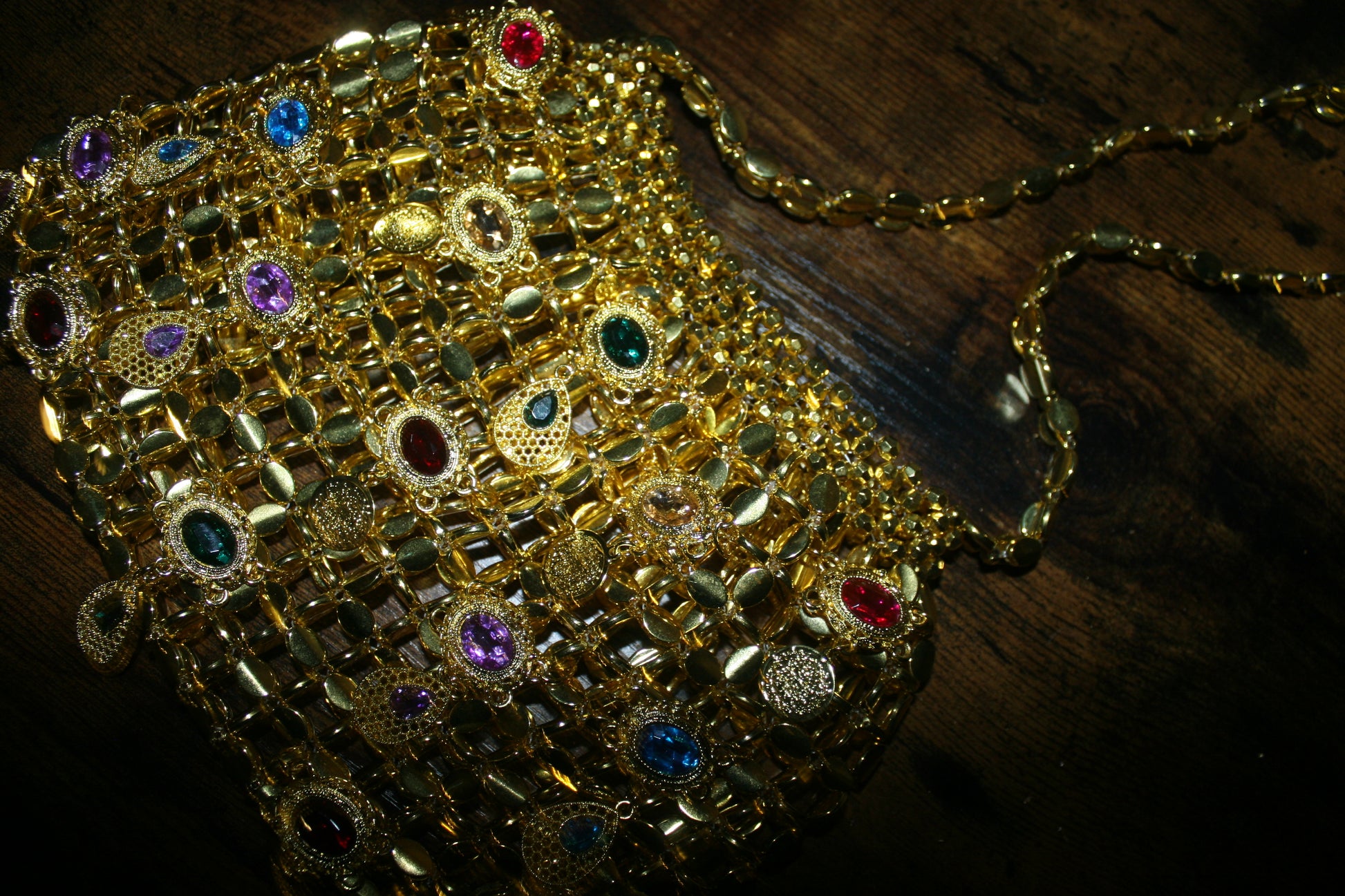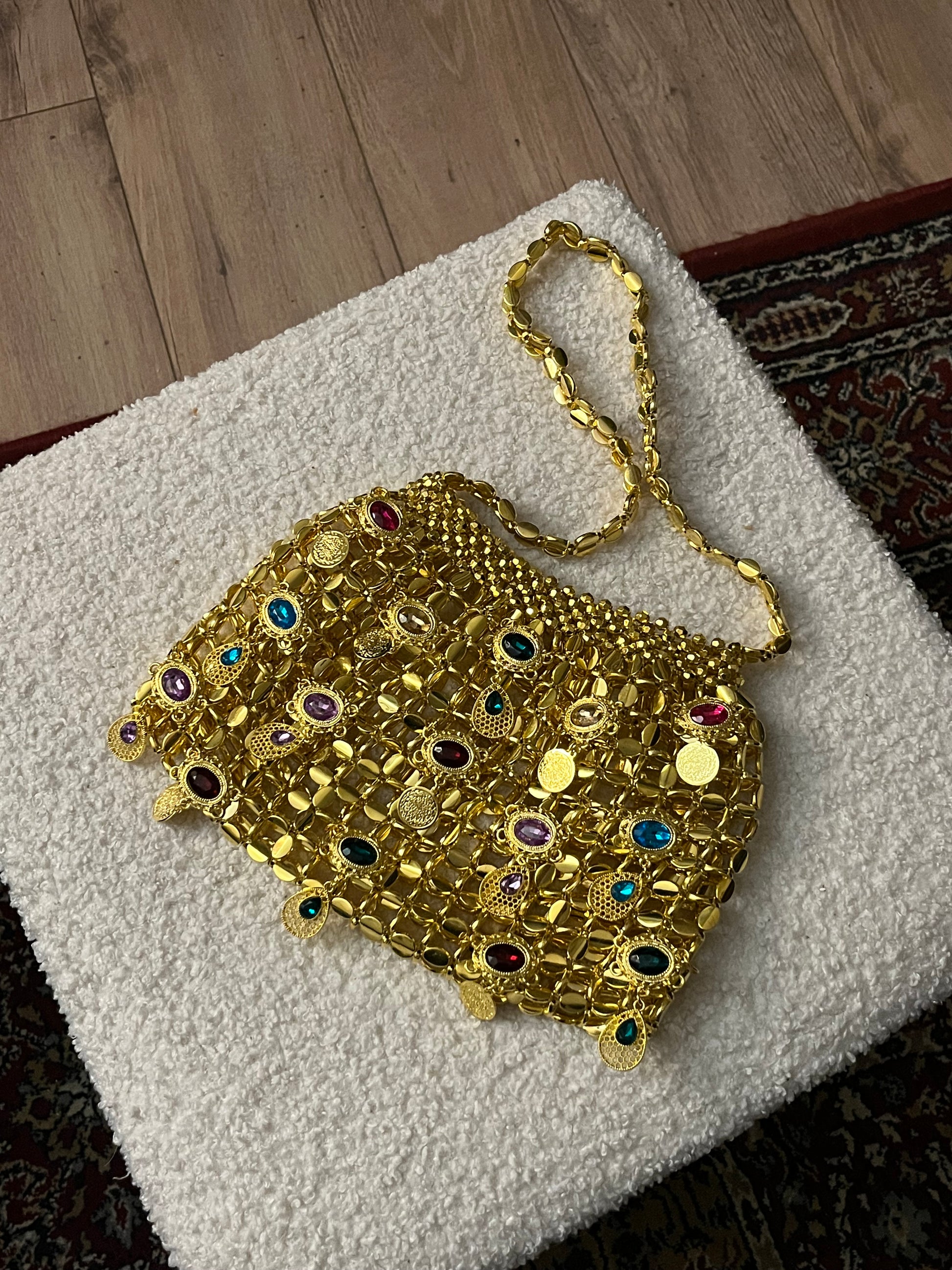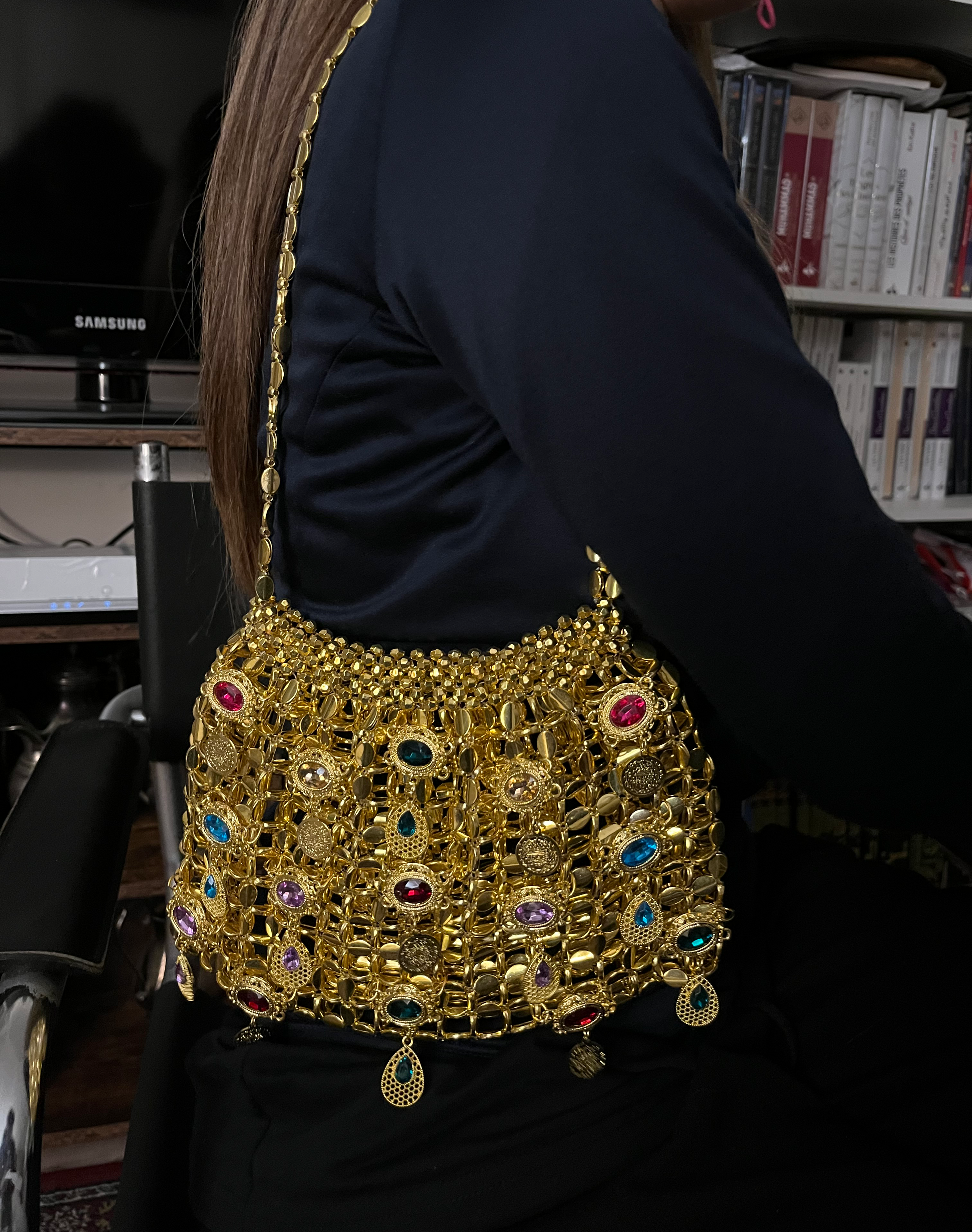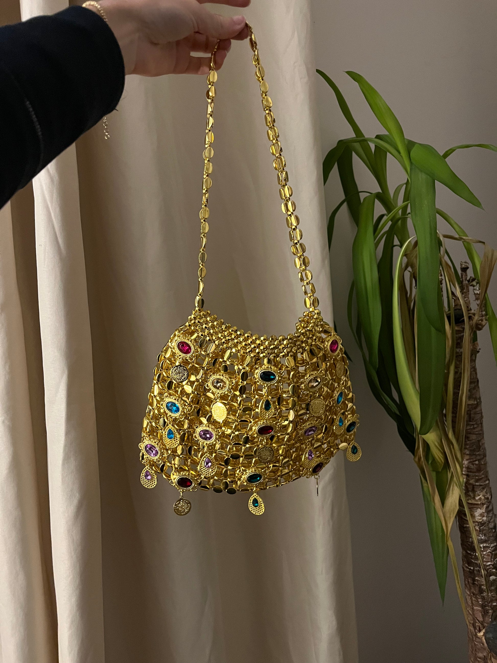 Découvrez Jasmine Majestic, la version la plus audacieuse et luxueuse de notre sac iconique. Avec sa base en perles dorées scintillantes, ce modèle se distingue par son ornementation somptueuse : une multitude de pierres colorées et de pendentifs précieux viennent habiller le sac, créant un jeu d’éclats et de reflets dignes d’un véritable trésor.