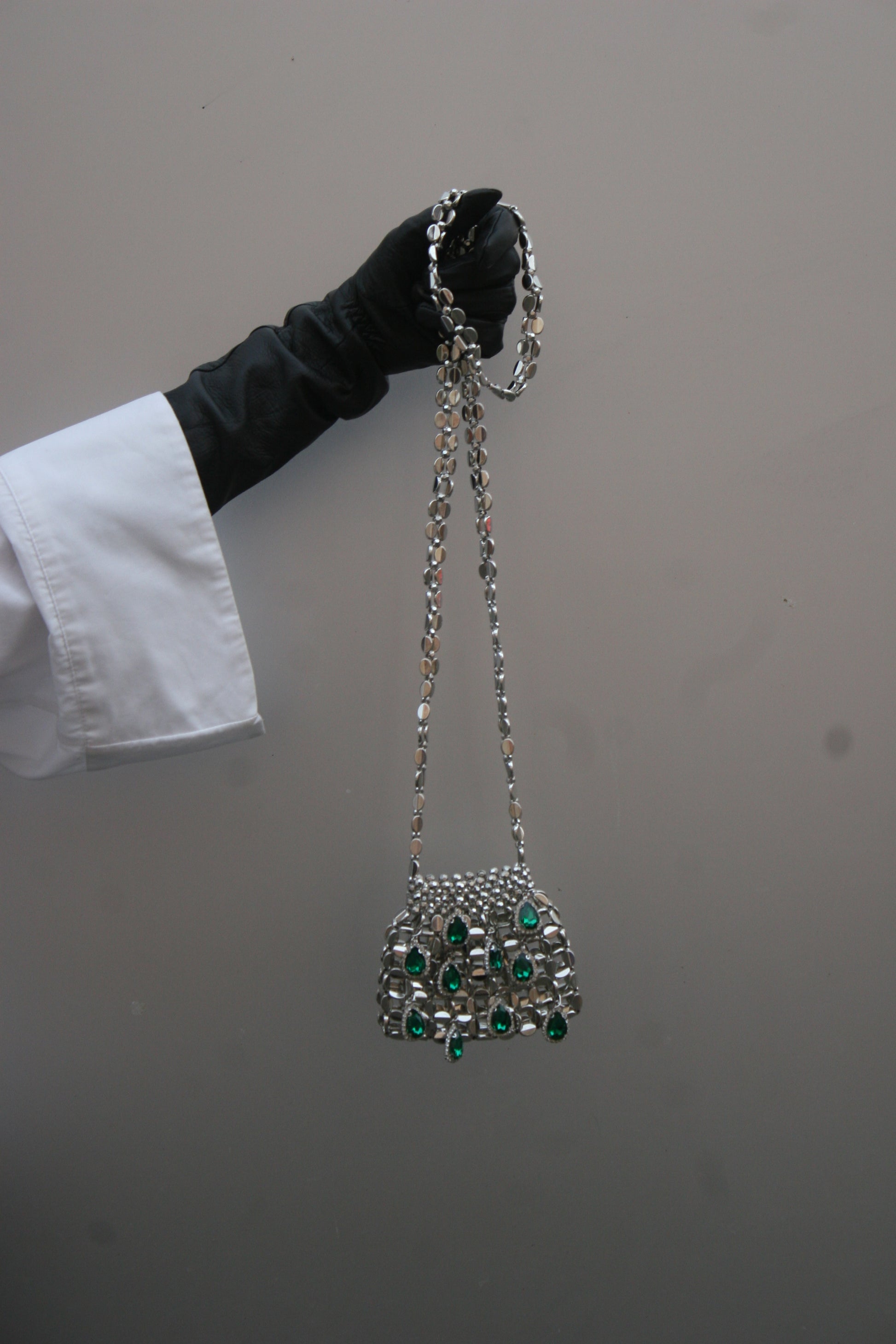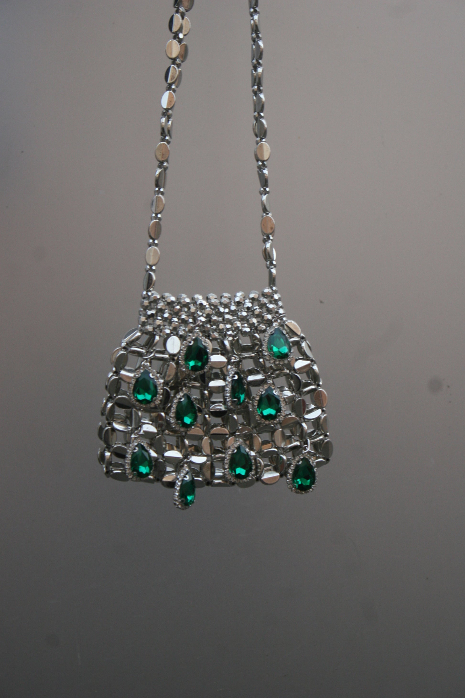 Découvrez Mini Esmeralda Silver, une version compacte et irrésistible du sac emblématique. Conçu en perles argentées brillantes, ce modèle séduit par ses cristaux verts suspendus qui évoquent de fines gouttes d’eau précieuses. Leur éclat vibrant contraste magnifiquement avec la structure métallique du sac, créant un jeu de lumière à chaque mouvement.