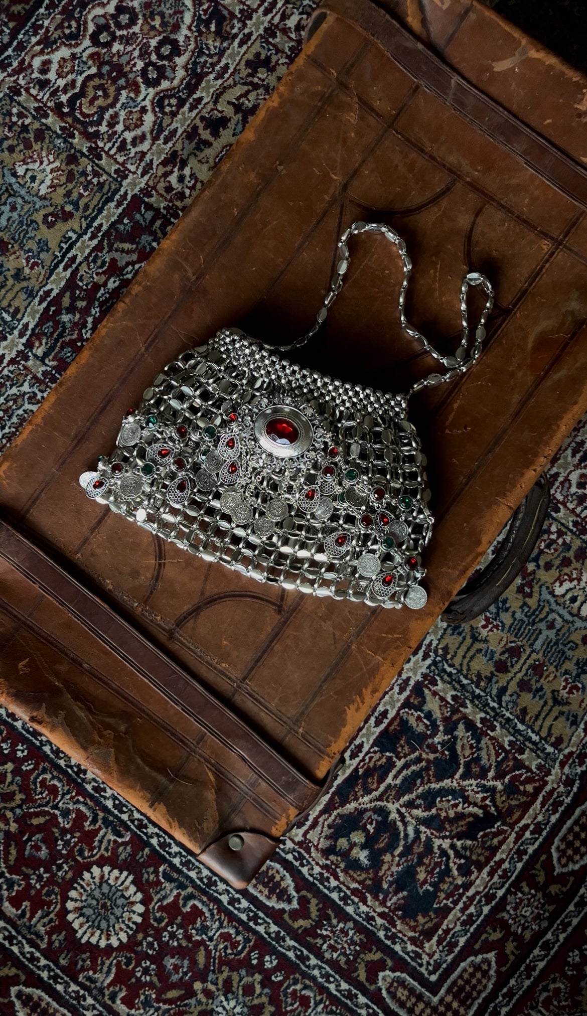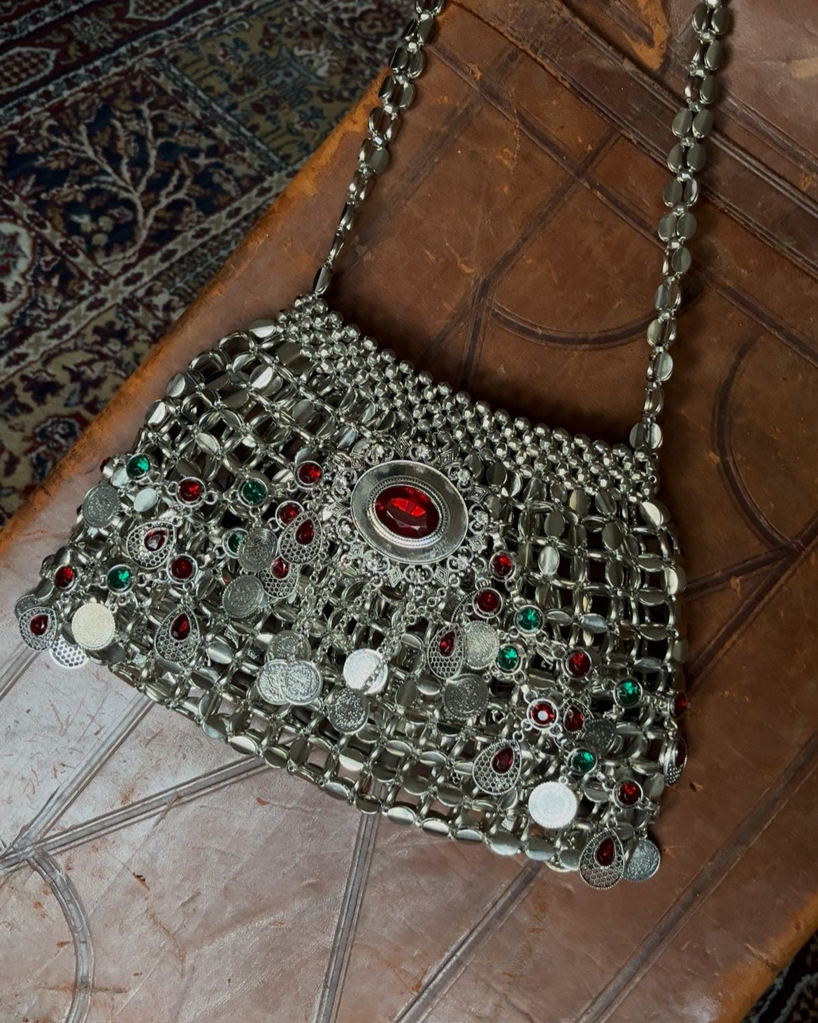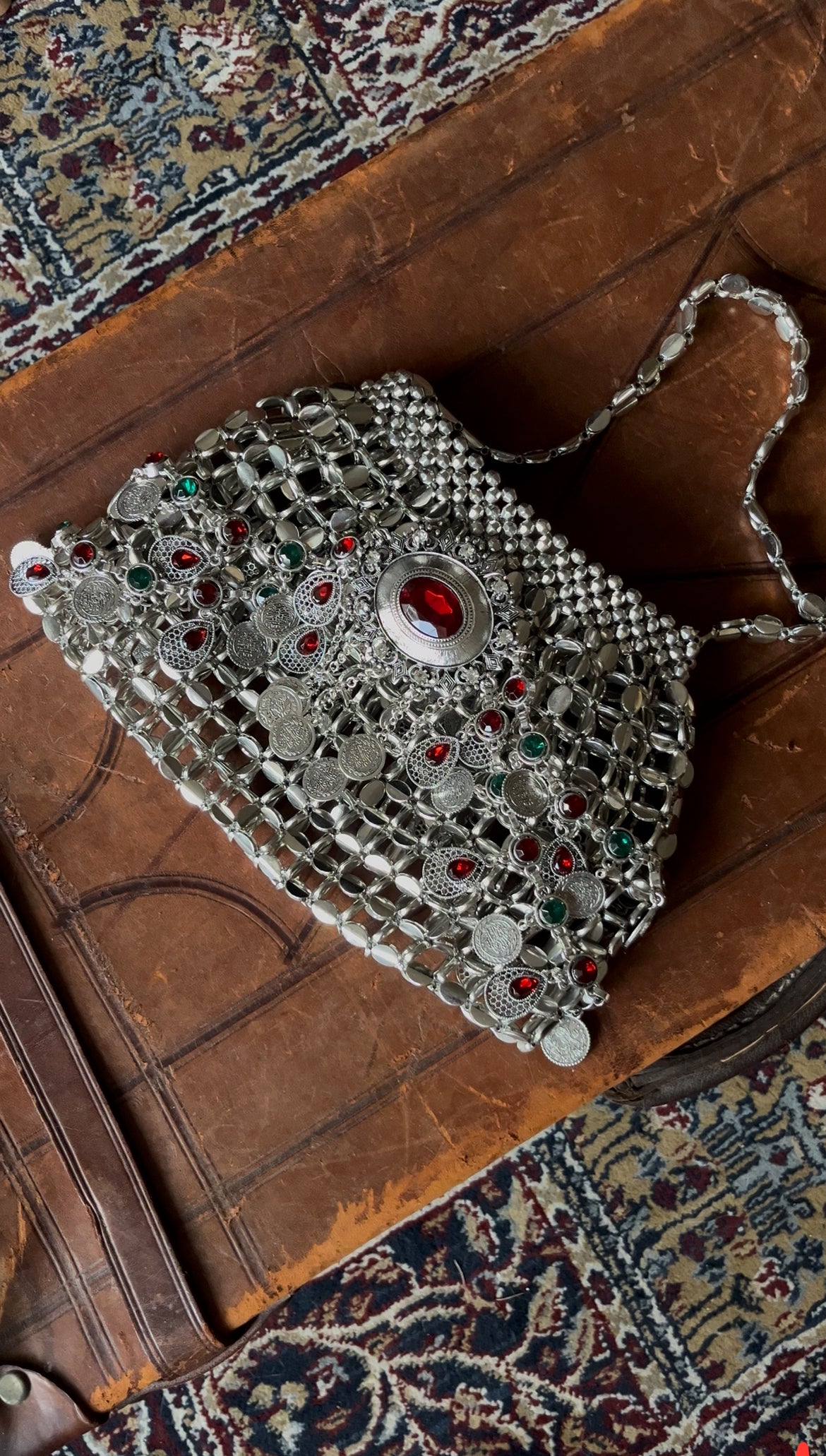 Découvrez Jasmine Silver, la version argentée de notre sac iconique. Ce modèle captivant est orné de pierres rouges profondes et vertes intenses, sublimées par une imposante pierre centrale rouge qui en fait une véritable pièce maîtresse. Chaque détail reflète l’élégance audacieuse de Catena, mêlant l’univers du bijou à celui de la maroquinerie.